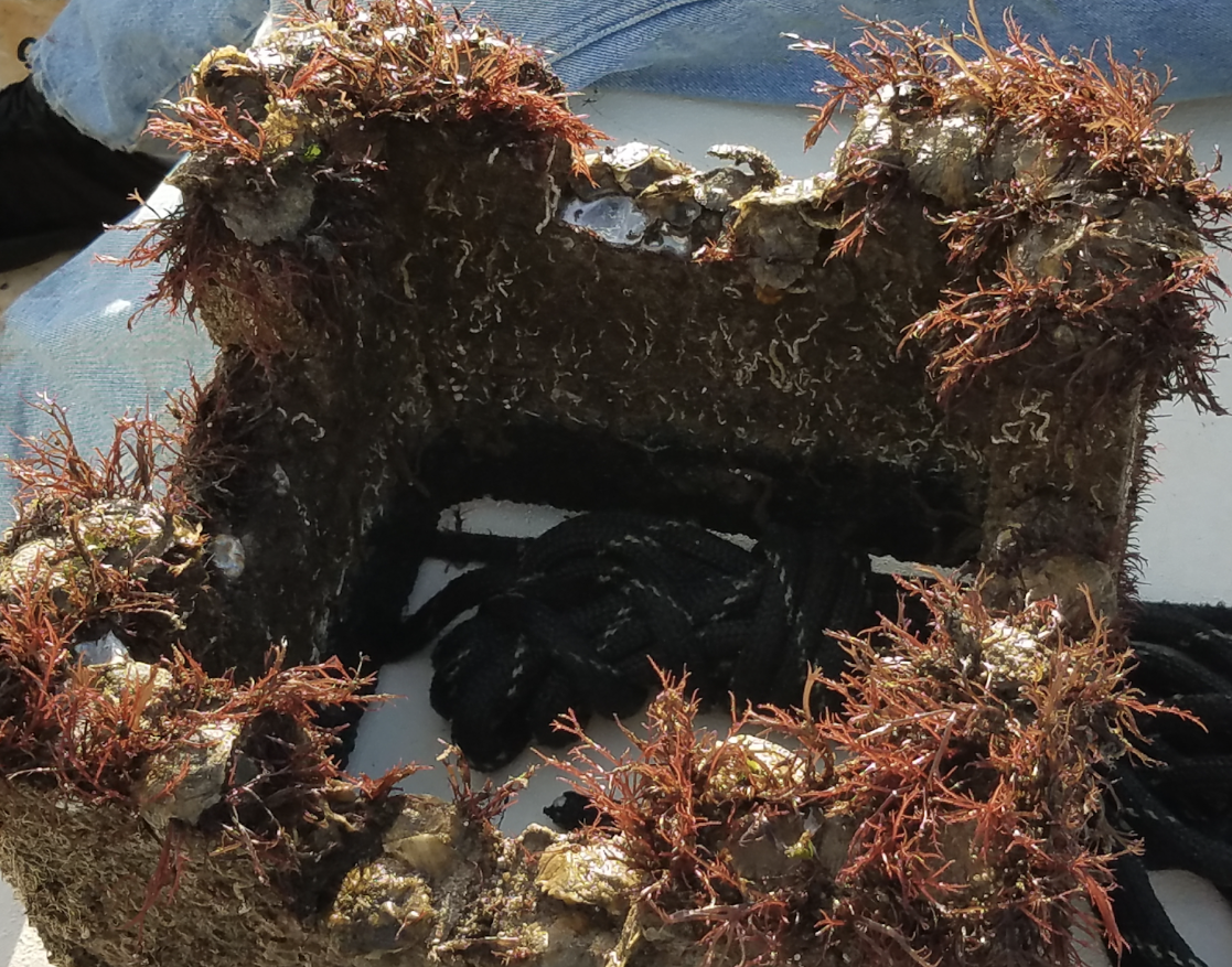 - Oyster castle with oysters and algae growing on it.