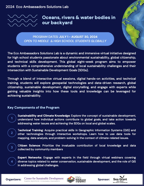 Complete this registration form by May 31, 2024 to apply to the 2024 Eco Ambassadors Solutions Lab run by the Center for Sustainable Development (CSD) of the Climate School at Columbia University and SDGs. You can review previous years’ programs at https://sdgstoday.org/eco-ambassadors-program.