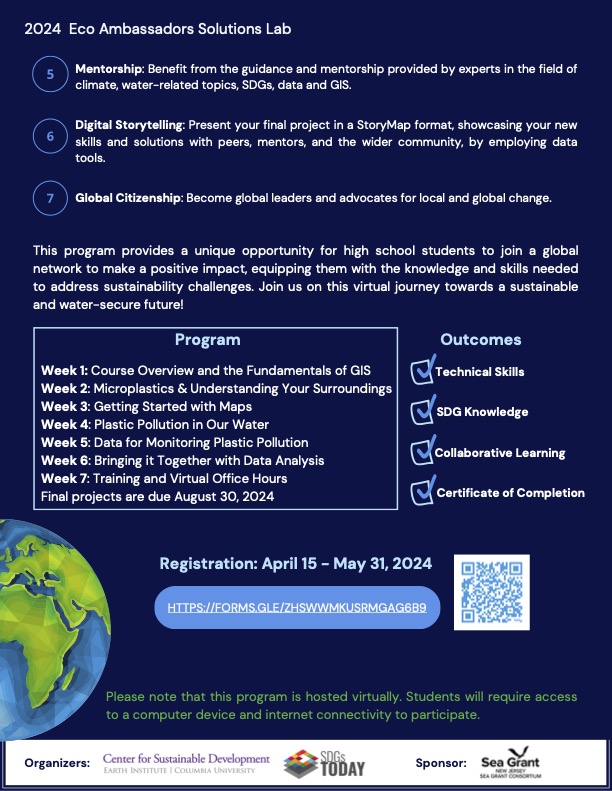 Complete this registration form by May 31, 2024 to apply to the 2024 Eco Ambassadors Solutions Lab run by the Center for Sustainable Development (CSD) of the Climate School at Columbia University and SDGs. You can review previous years’ programs at https://sdgstoday.org/eco-ambassadors-program.