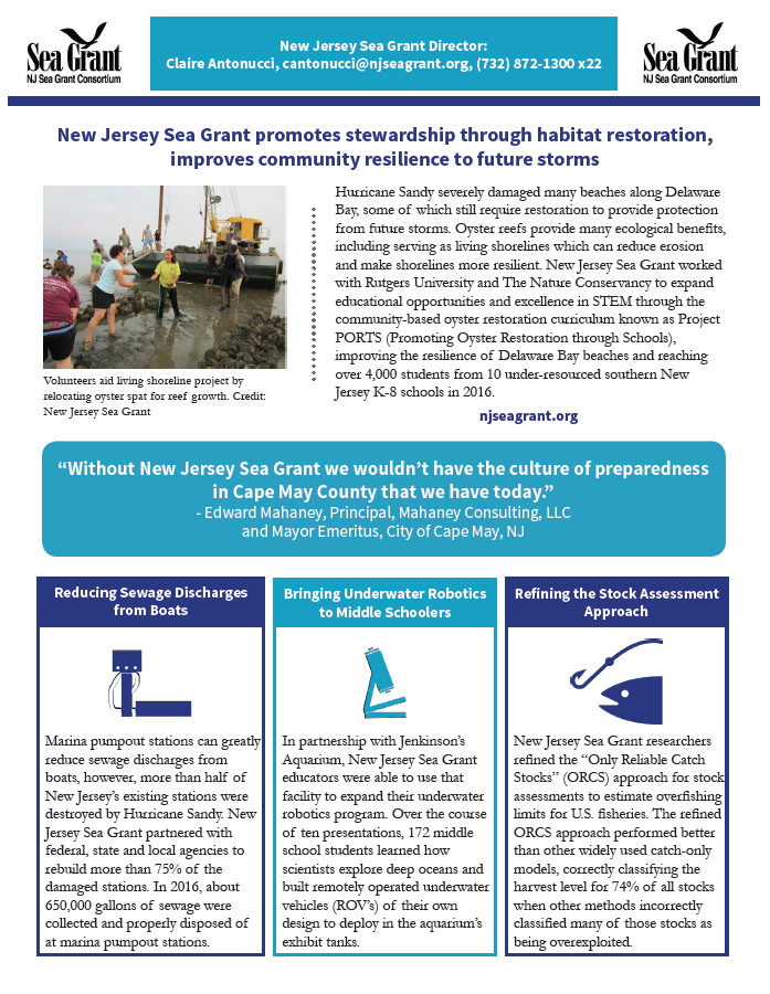 Please accept our sincerest appreciation for your past support of Sea Grant and New Jersey Sea Grant Consortium. Last year, you reached out and told your elected officials how important Sea Grant is to you, our state, and the nation. You were most definitely heard. Congress soundly rejected the Administration’s proposal to eliminate all Sea Grant programs. This allowed us to continue to work with you on so many crucial issues including stormwater management, coastal resilience, supporting the shore tourism and boating industries, and providing environmental and STEM educational experiences for children, college students, and the public.